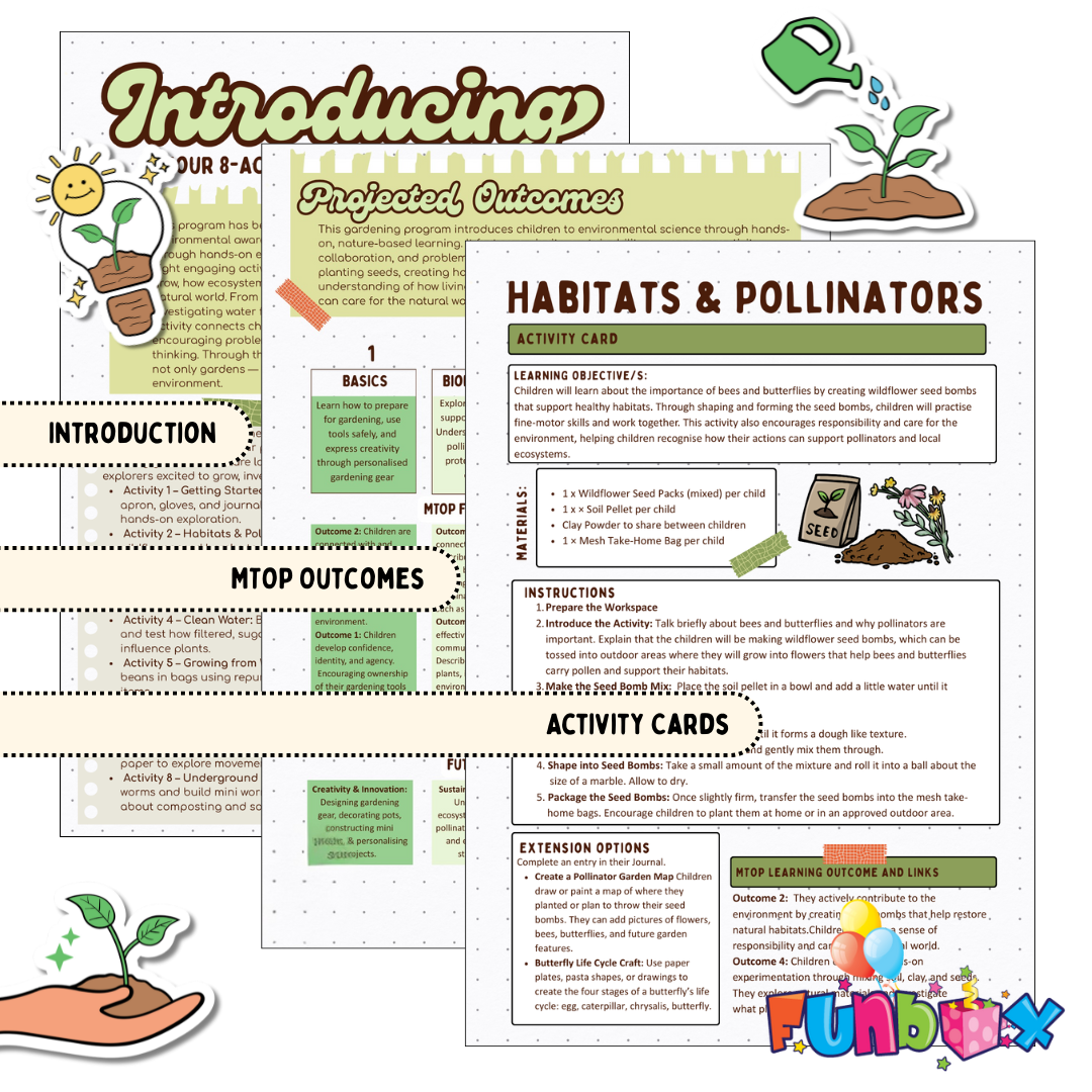 This hands-on gardening and environmental program invites children to explore nature through eight engaging, activity-based experiences. Designed to spark curiosity and creativity, the program introduces key ecological concepts such as plant growth, habitats, clean water, pollinators, recycling, and underground ecosystems.